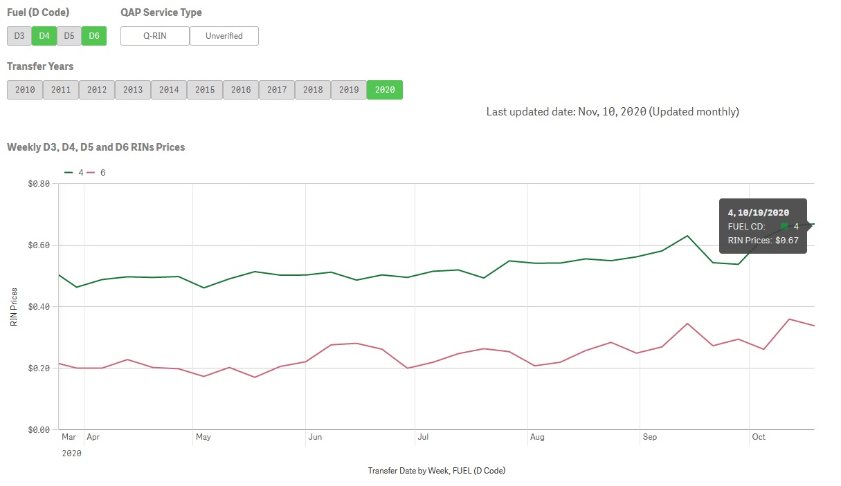 Throughout 2020, RIN prices have been steadily climbing, perhaps signaling a strengthening market for biofuels. D4 RIN prices for biomass-based diesel rose from $.48 on January 6, 2020 to $.67 on October 19, 2020. If that sounds like a lot of growth over a short period, it’s next to nothing compared with the performance of the “baseline” D6 RIN credit for ethanol. On January 6, D6 RINs traded at just six cents, according to the Environmental Protection Agency. As of October 19, the price was up to $.34, more than five times its going rate at the top of the year.